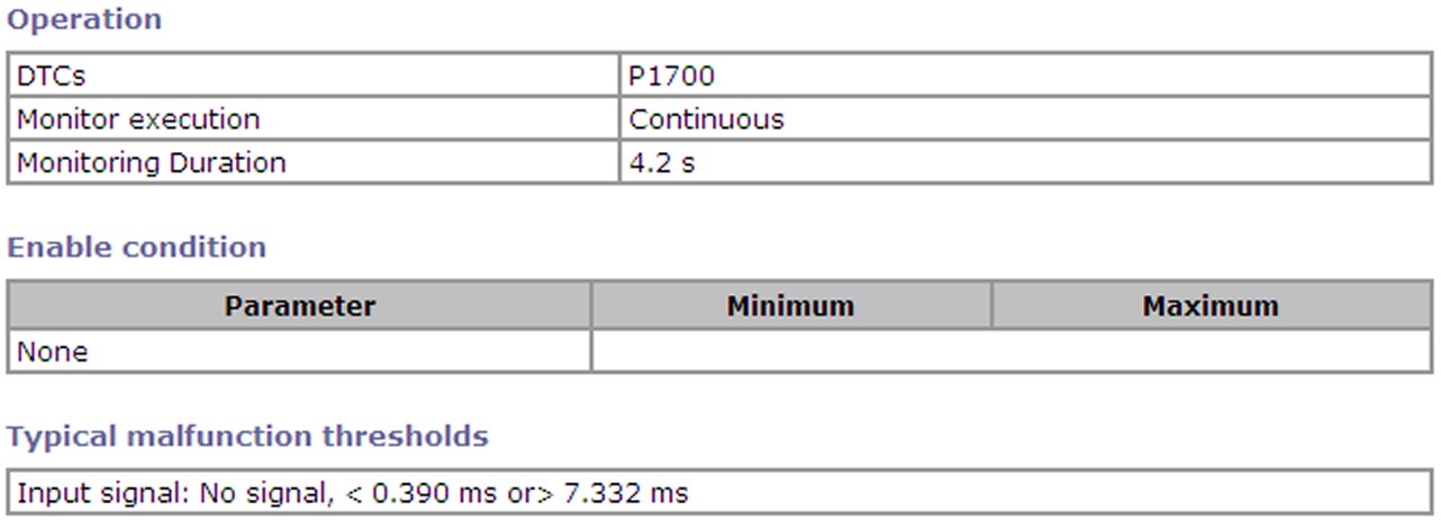 Input signals of transmission range switch (Shift position switch) (P0707) is checked for open, short of circuit by monitoring input voltage.