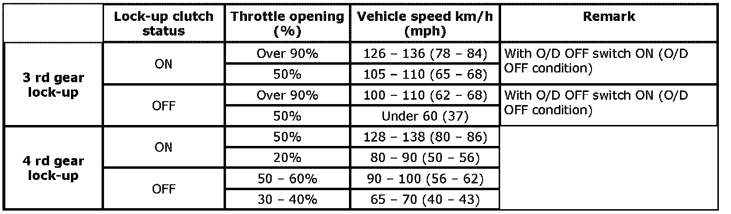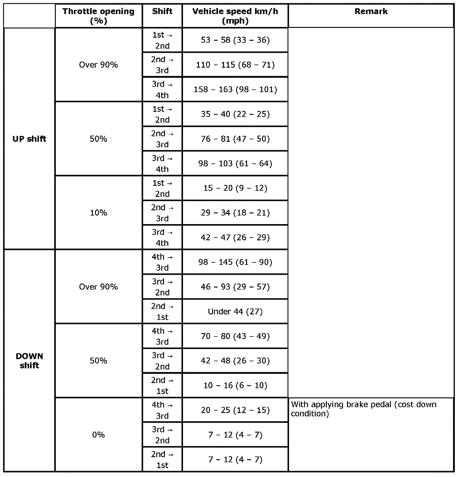 AUTOMATIC GEAR SHIFT TABLE (FOR 2WD MODEL)Automatic gear shift schedule is shown in the table. Test-drive the vehicle on a flat road in the D position.