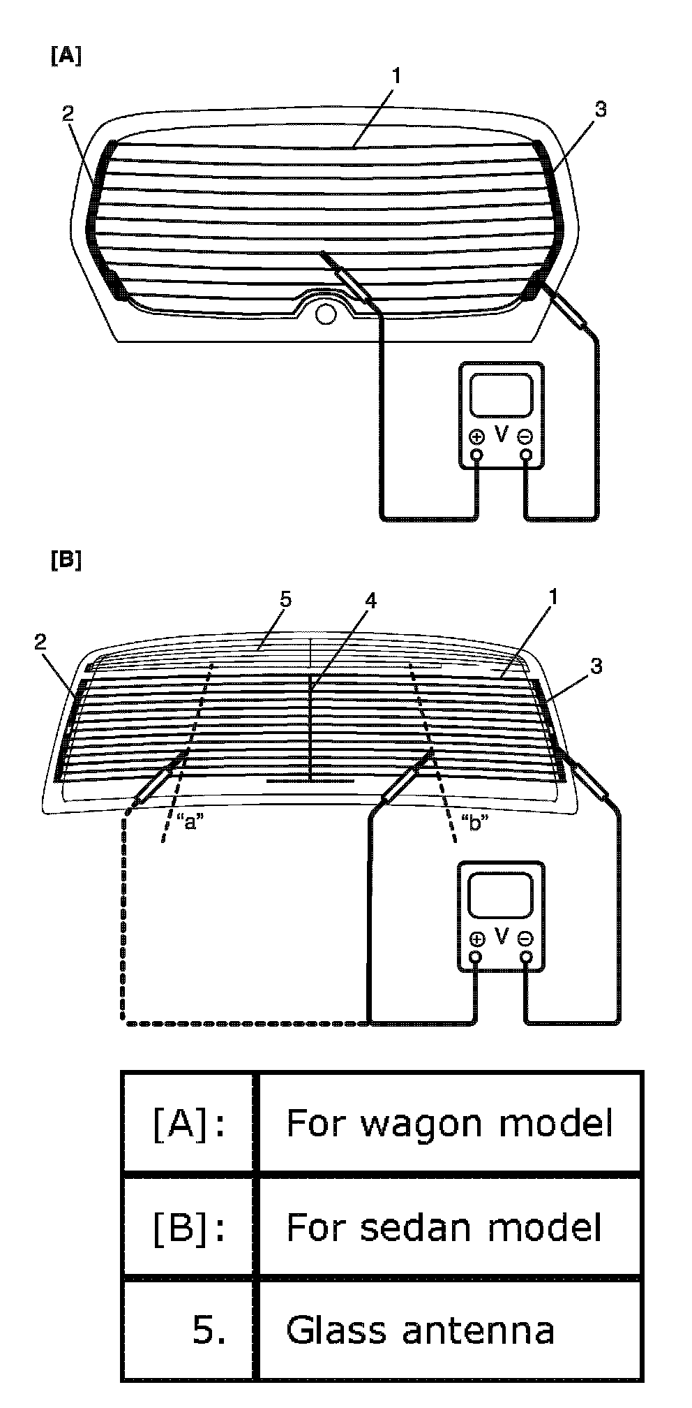 Measure voltage at position "a" and position "b" of each defogger wire (1), and check defogger wire condition according to the following table.
