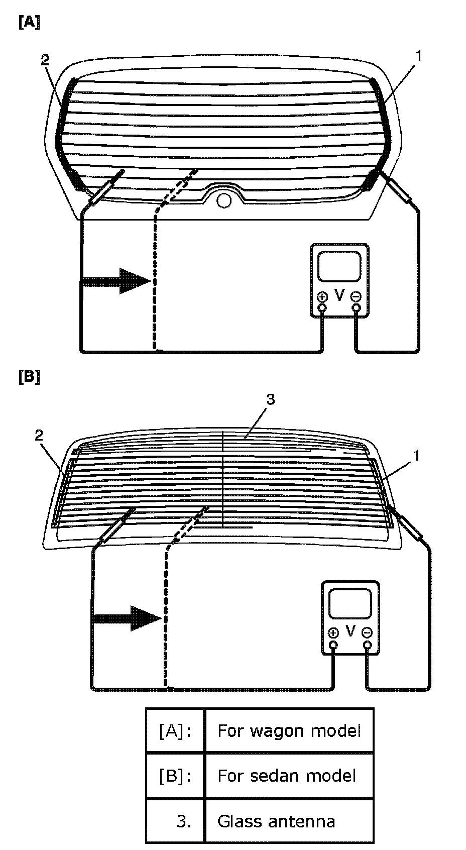 Measure voltage at the center of each defogger wire (1), and check defogger wire condition according to the following table.