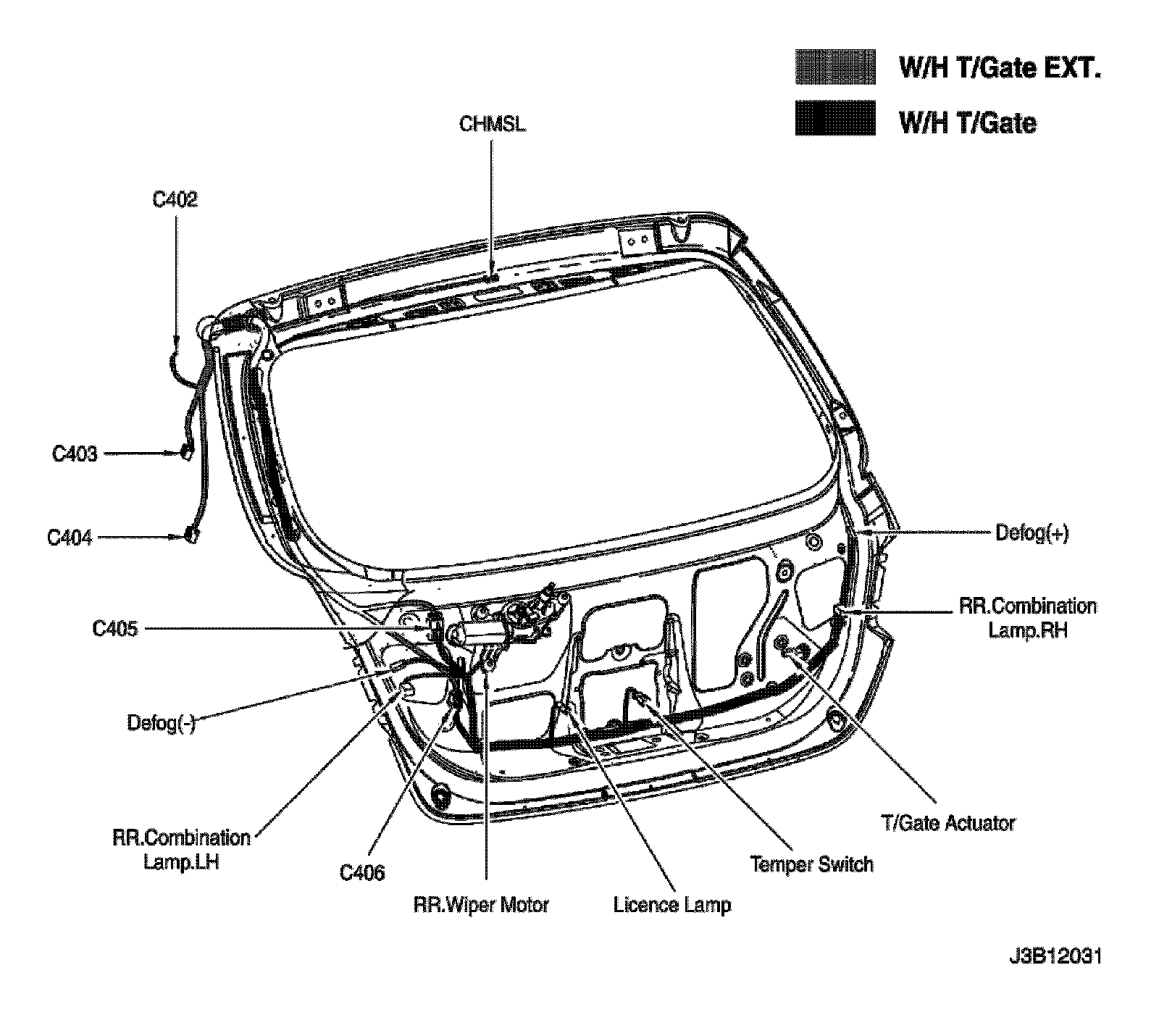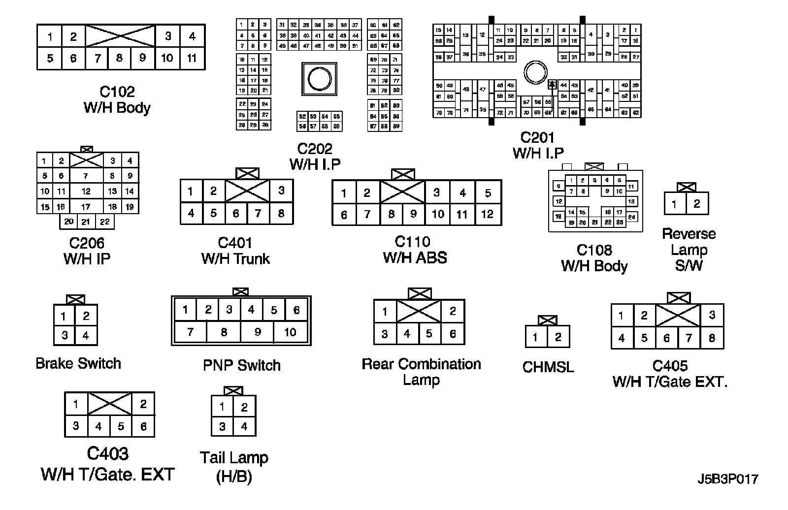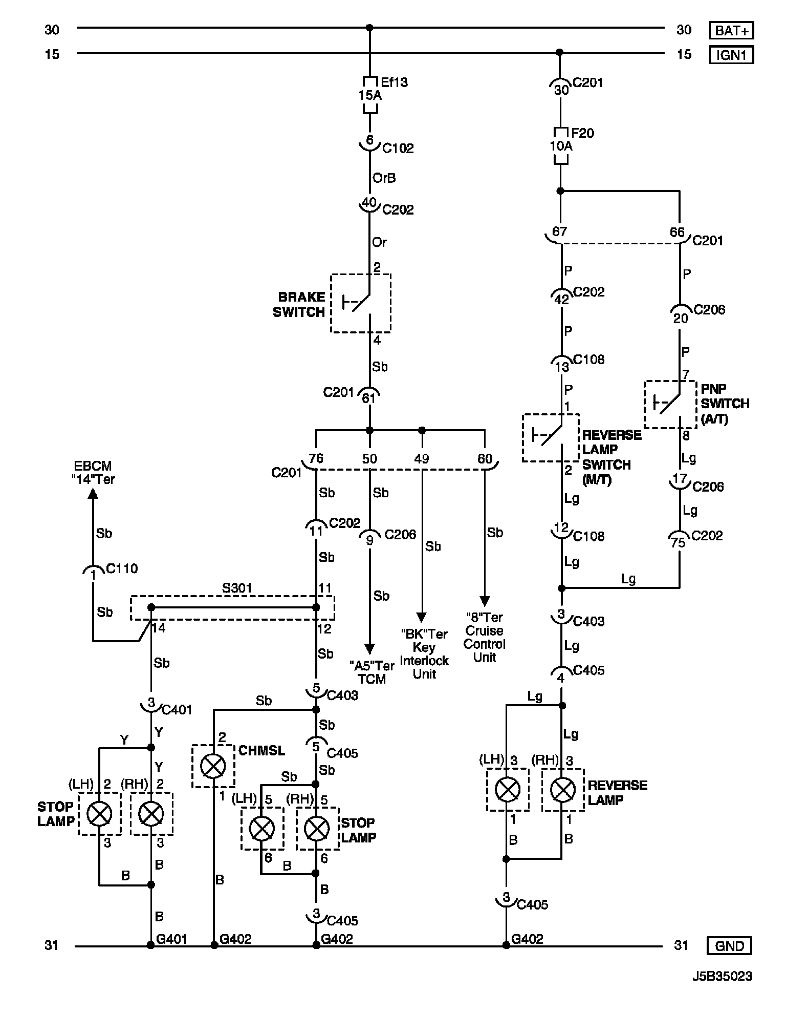 Stop Lamp, Center High Mount Stop Lamp (CHMSL) and Reverse Lamp Circuit Wiring Diagram: