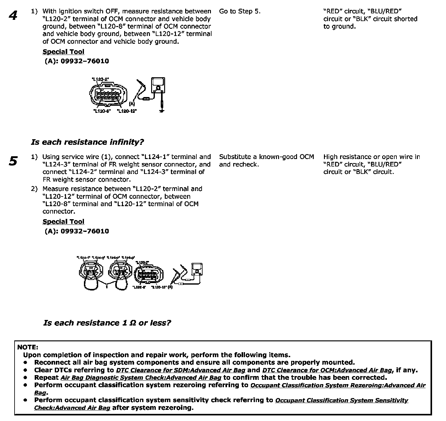 - If there is open circuit in air bag wire harness, connector or terminal is found damaged, replace the wire harness, connector and terminal as an assembly.