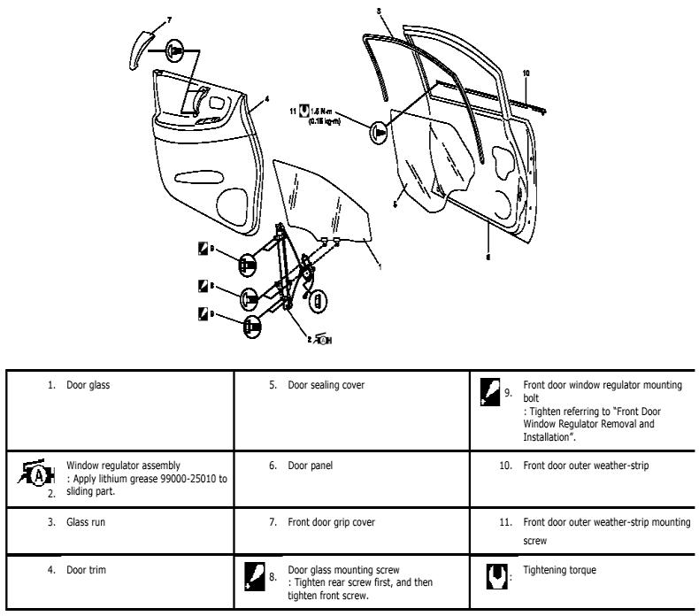 Front door outer weather-strip mounting screw ((a)): 1.5 Nm (0.15 kg-m, 1.0 ft. lbs.)