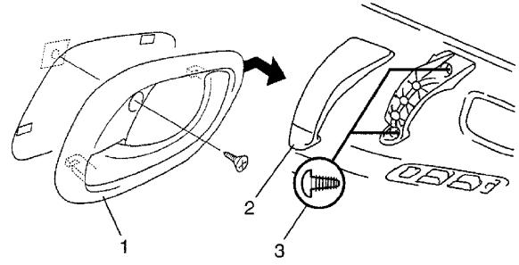 2. Remove inside door grip cover (2), and then remove door trim mounting bolts (3).
