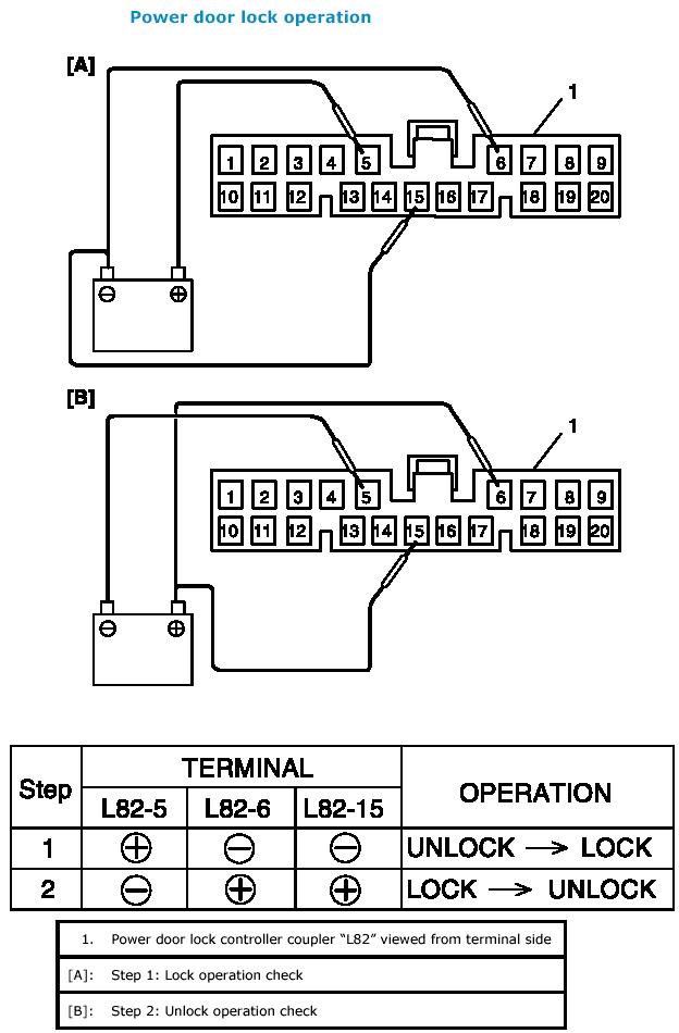 3. Confirm that all doors are unlocked. Connect battery positive (+) and negative (-) terminals to door lock controller coupler terminals, and check door lock and unlock operation as follows.