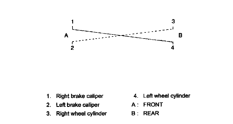 Bleeding operation is necessary to remove air whenever it entered hydraulic brake system. Hydraulic lines of brake system are based on the diagonal split system. When a brake pipe or hose was disconnected at the wheel, bleeding operation must be performed at both ends of the line of the removed pipe or hose. When any joint part of the master cylinder of other joint part between the master cylinder and each brake (wheel) was removed, the hydraulic brake system must be bled at all 4 wheel brakes.