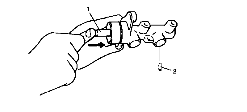 4. Remove primary piston. Then remove secondary piston by blowing compressed air (2) into hole. Be cautious during removal as secondary piston jumps out.