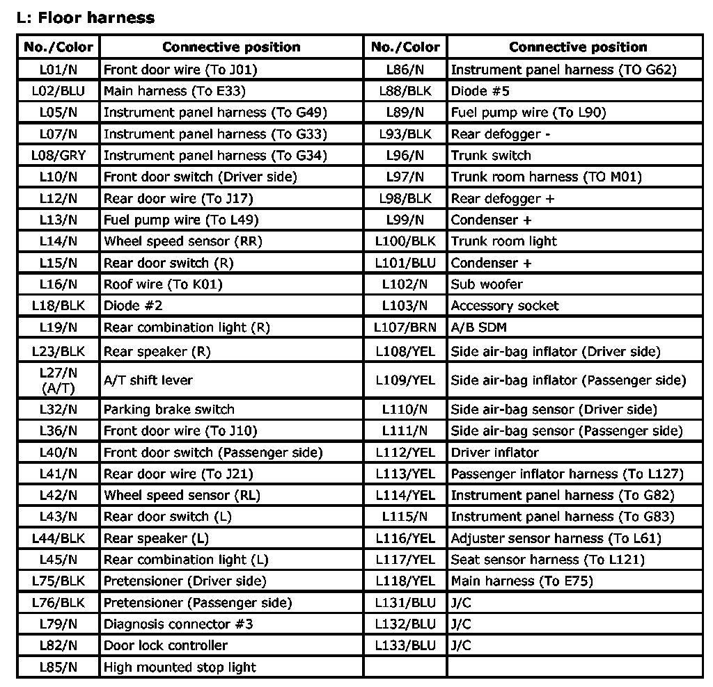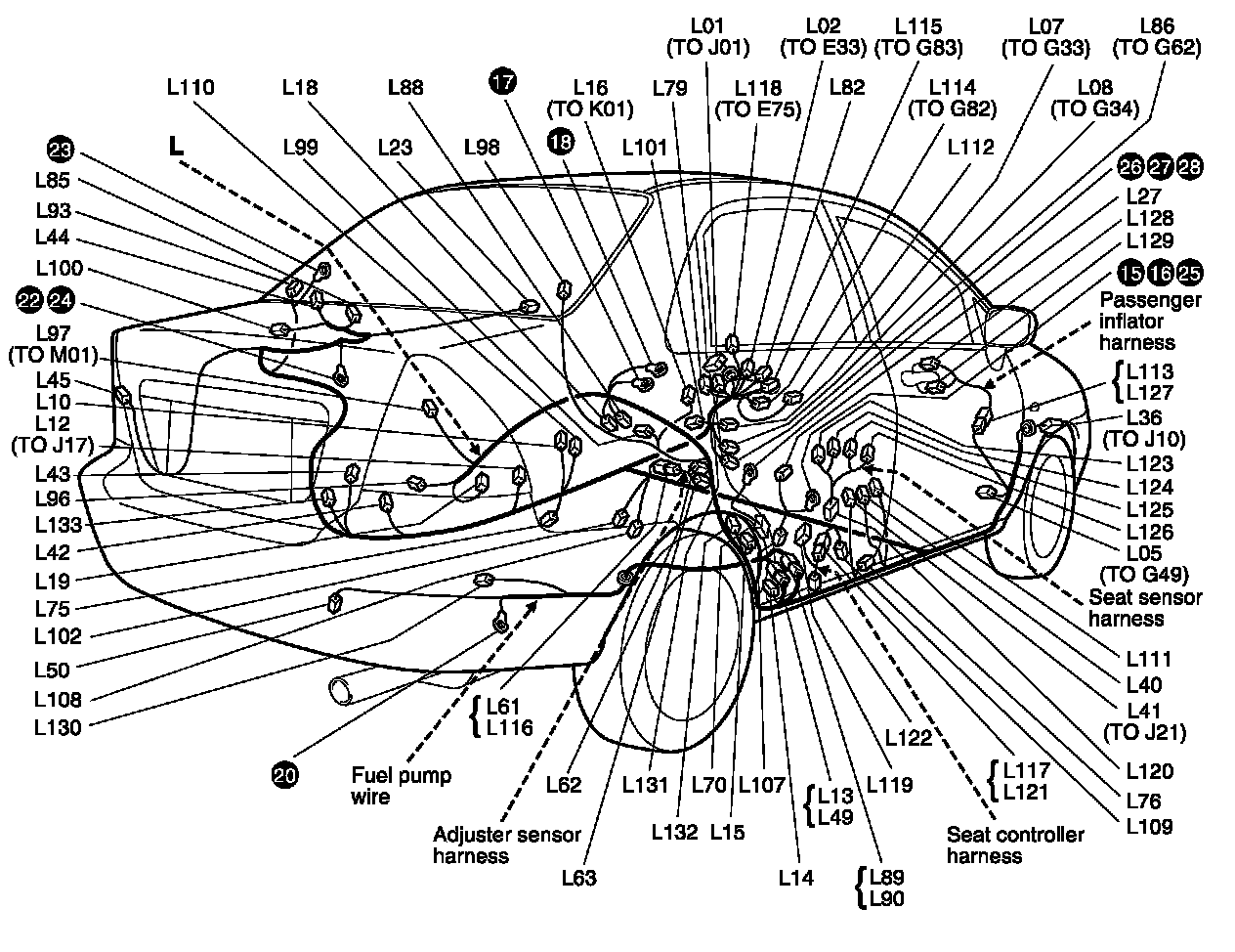L:Fuel pump wire/Adjuster sensor harness/Seat controller harness/Seat sensor harness/Passenger inflator harness (Sedan) Index: