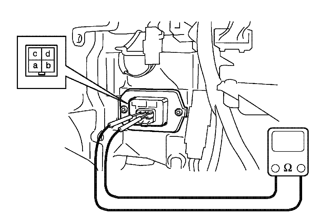4. Measure resistance between "c" and "d" terminals of blower motor controller.