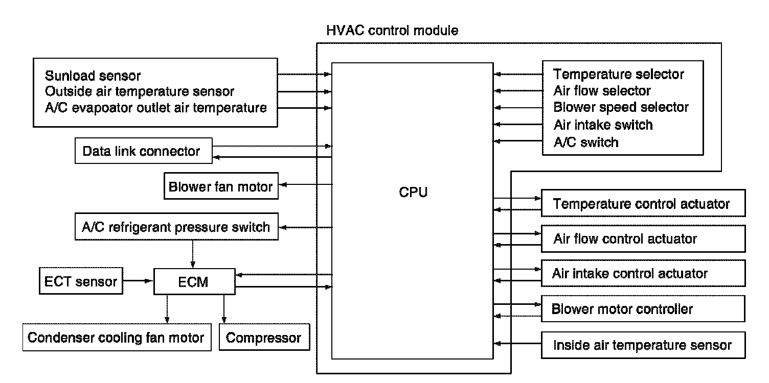 A/C System IntroductionAutomatic air conditioning system is that controller in HVAC control module (1) automatically controls in-car temperature, fan speed, airflow outlet and so forth. Once users set up desired in-car temperature by temperature selector of HVAC control module, the controller in HVAC control module detects in-car temperature, outside air temperature, amount of sunlight, and engine coolant temperature by inside air temperature sensor (2), outside air temperature sensor (3), sunload sensor (4), and ECT sensor (5). Then, controller of HVAC control module keeps desired in-car temperature at any time.