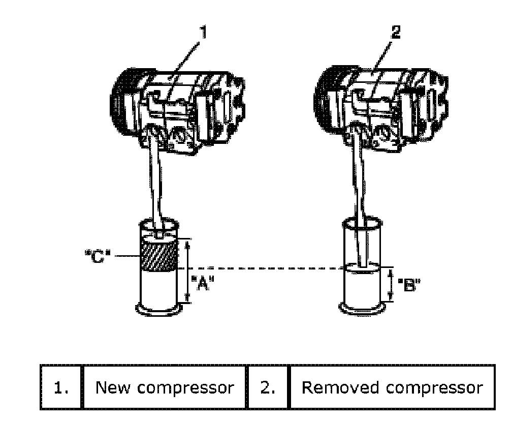 "B": Amount of oil remaining in removed compressor