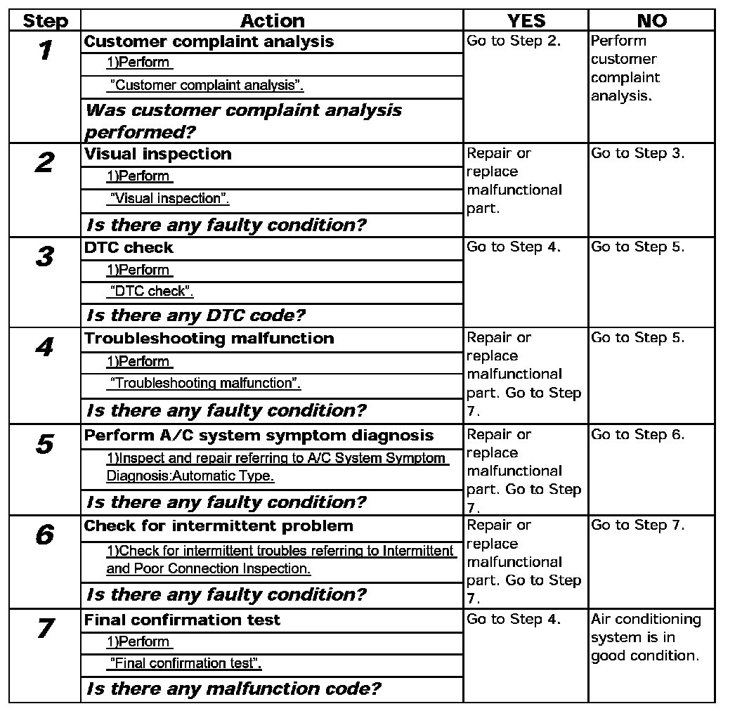 As a preliminary step, be sure to perform visual check of the items that support proper function of the air conditioning referring to Visual Inspection: Automatic Type.