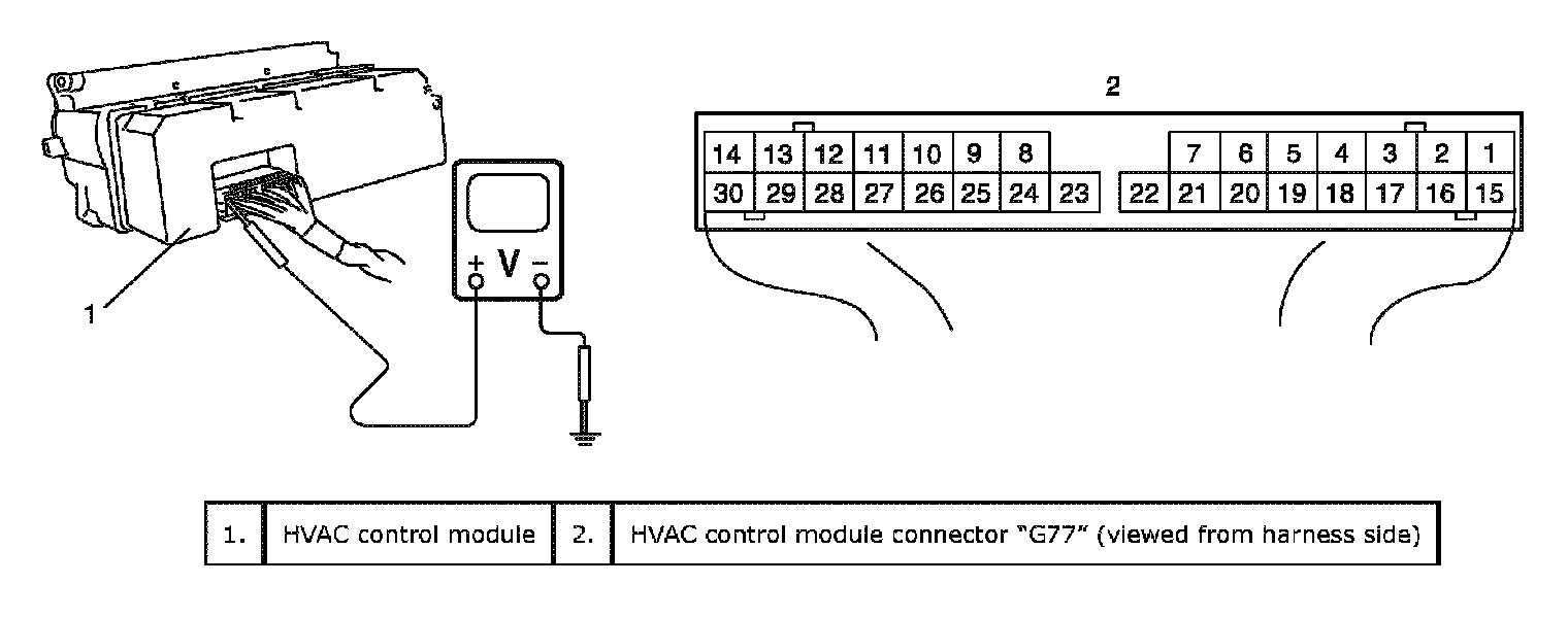 CAUTION: HVAC control module can not be checked by itself. It is strictly prohibited to connect voltmeter to HVAC control module with couplers disconnected from it.