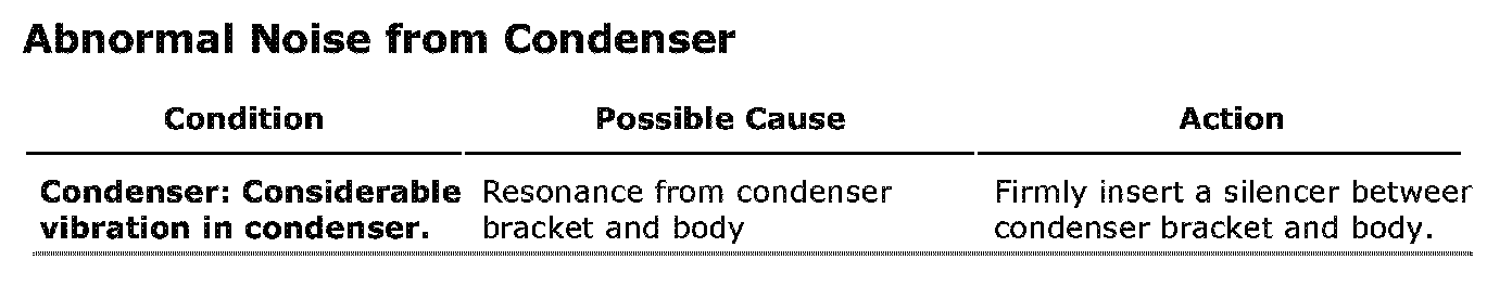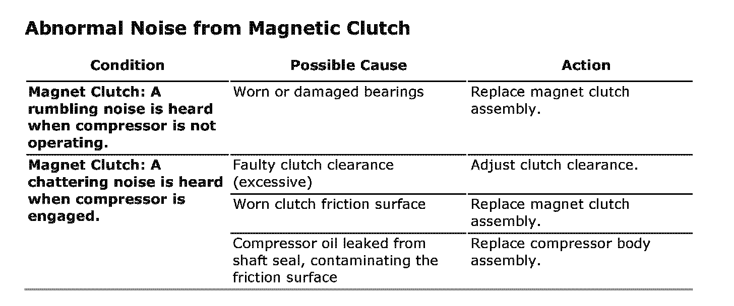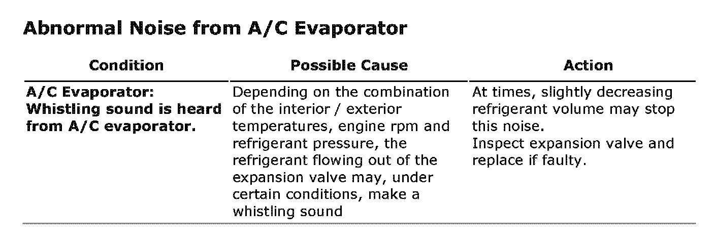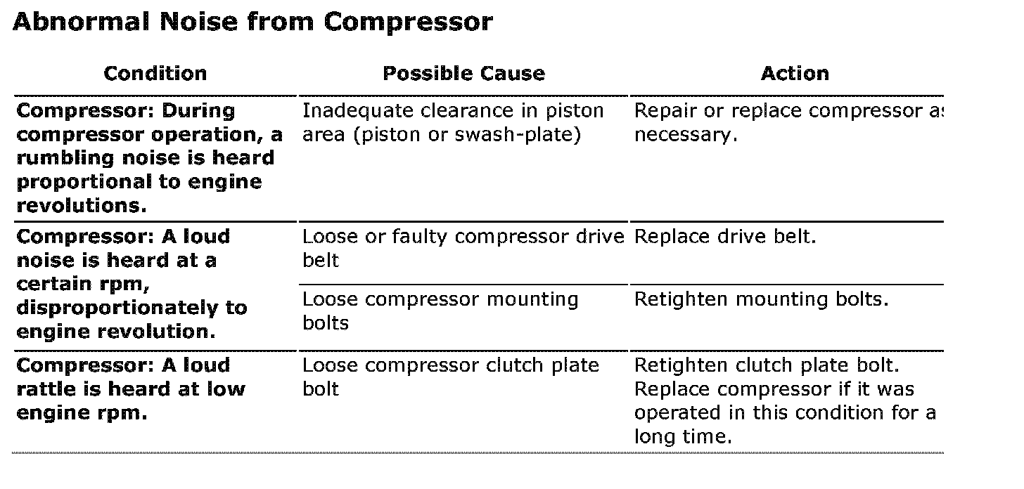 Abnormal Noise Symptom Diagnosis of A/C SystemThere are various types of noise, ranging from those produced in the engine compartment to those from the passenger compartment, also from rumbling noises to whistling noises.