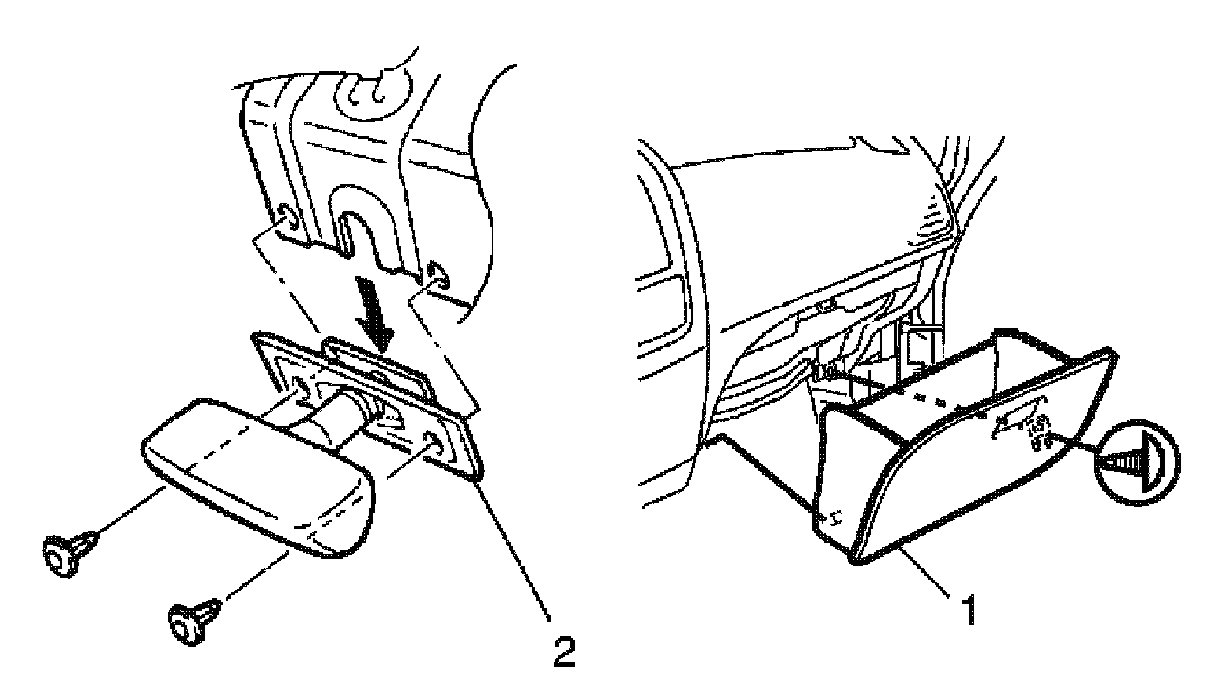 5. Remove glove box (1) and hood latch release lever (2).
