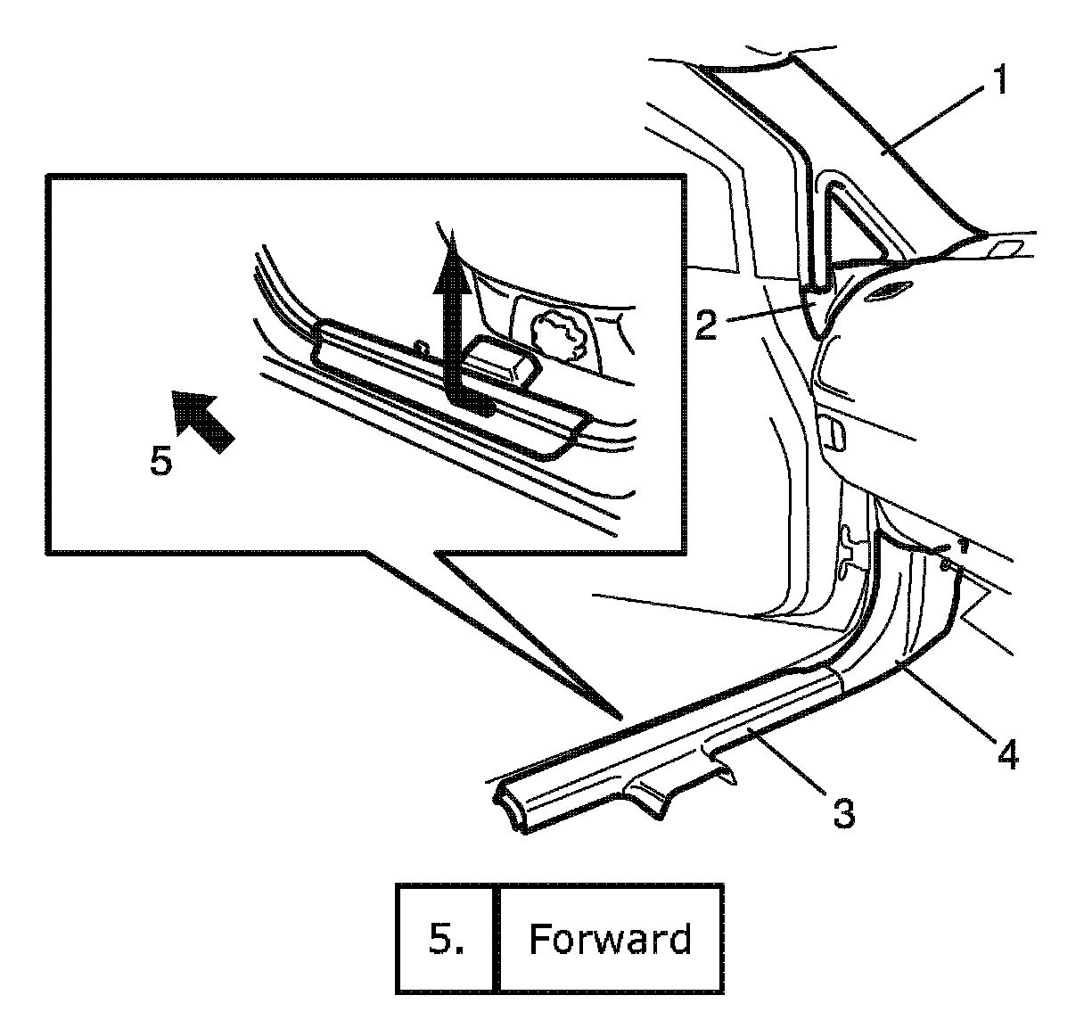 8. Remove front pillar trims (1), front pillar lower garnishes (2), front side sill scuffs (3) and dash side trims (4).