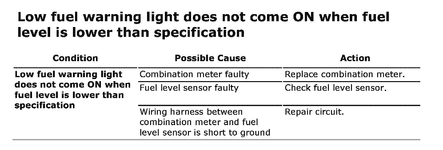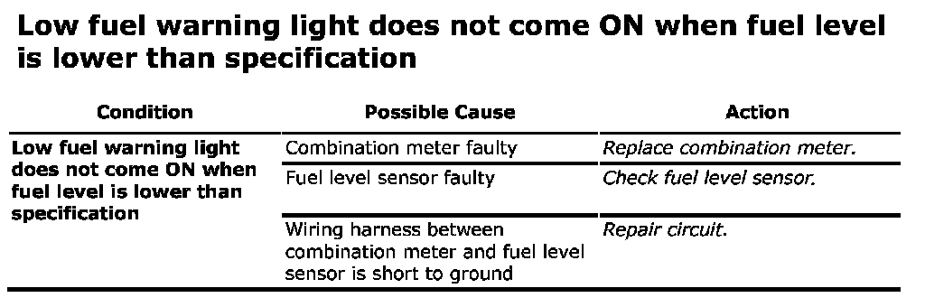 Low Fuel Warning Light Does Not Come on When Fuel Level Is Lower Than Specification