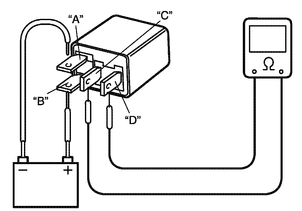 4. Check continuity between terminal "C" and "D". If there is no continuity when relay is connected to the battery, replace relay.