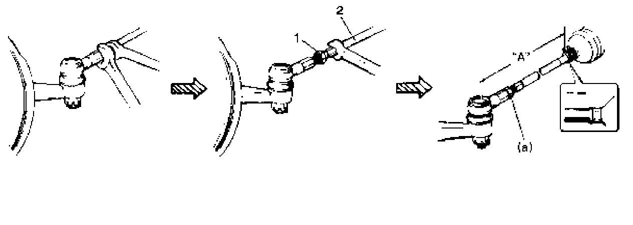 2) Rotate right and left tie-rods (2) by the same amount to align toe to specification. In this adjustment, right and left tie-rods (2) should become equal in length "A".