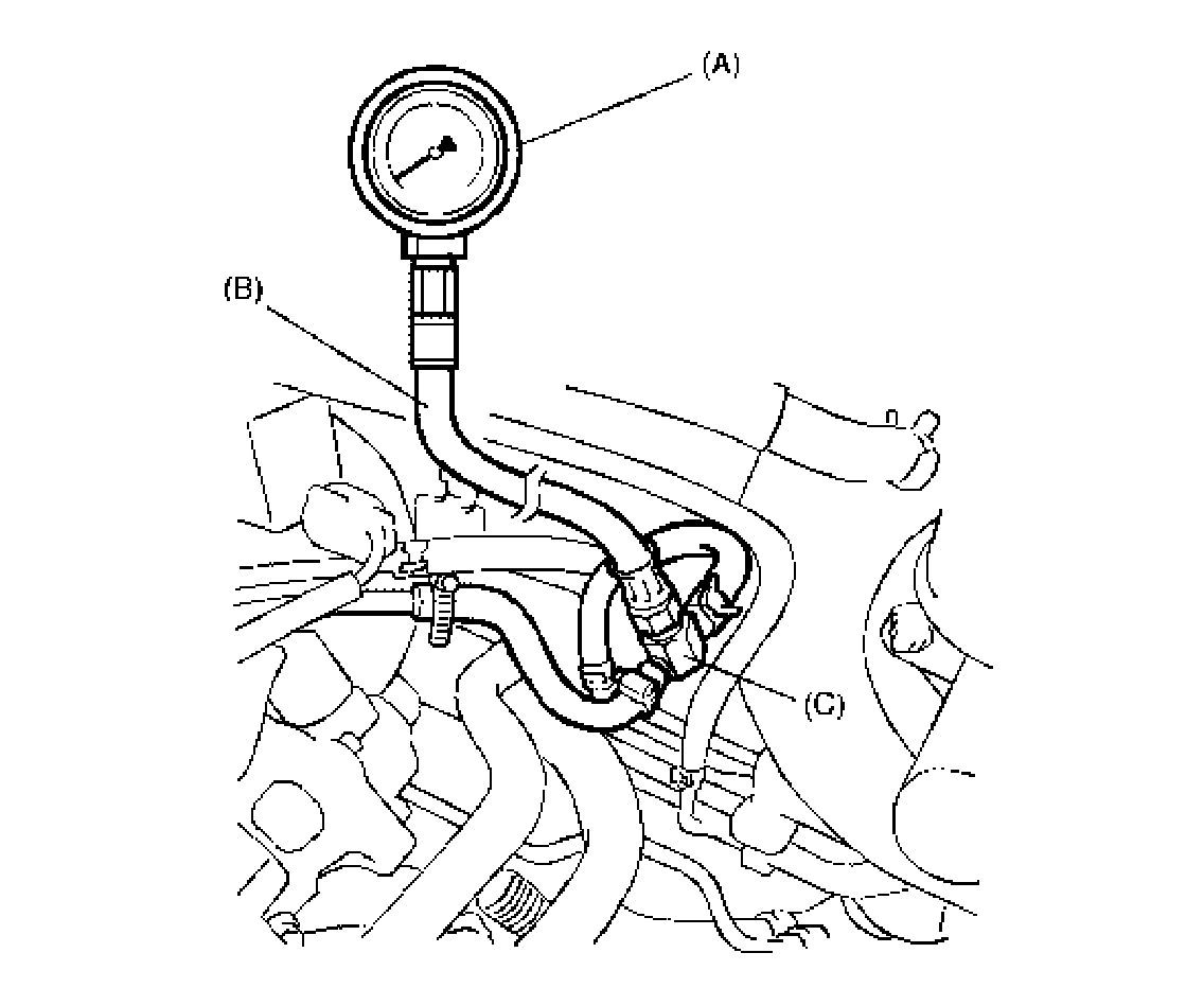 3) Connect special tools and hose between fuel feed hose and fuel delivery pipe as shown in figure, and clamp hose securely to ensure to no leaks occur during checking.