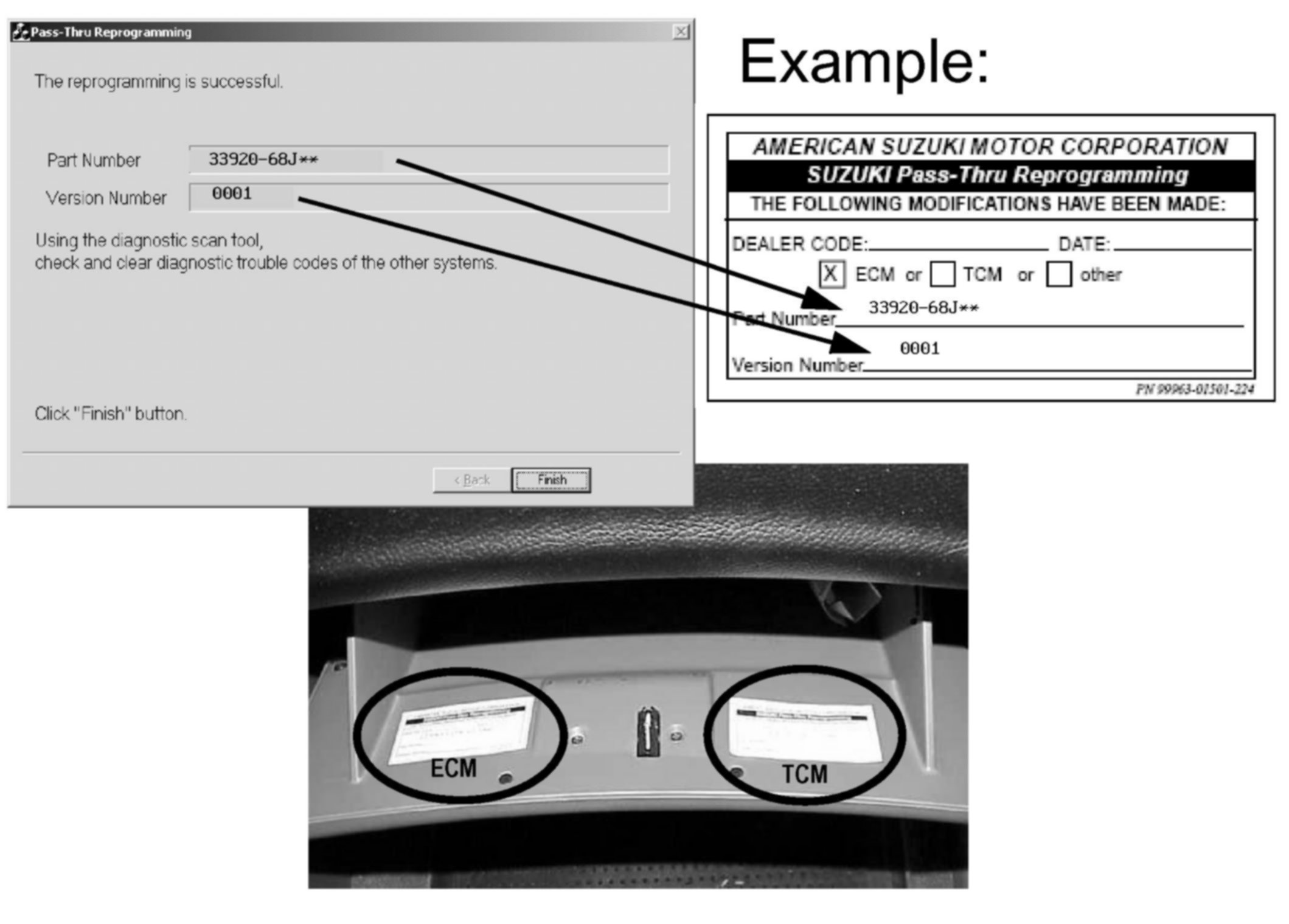 6. Fill out the Reprogram Label P/N 99963-01501-224 (the part number and version will be displayed at the "The reprogramming is successful" screen). Then affix the label to the back of the glove box door as pictured.