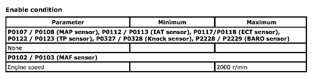 Input signals of MAF (P0102 / P0103), MAP (P0107 / P0108), IAT (P0112 / P0113), ECT (P0117 / P0118), TP (P0122 / P0123), Knock sensor (P0327 / P0328) and Barometric pressure sensor (P2228 / P2229) are checked for open, short of circuit by monitoring input voltage.