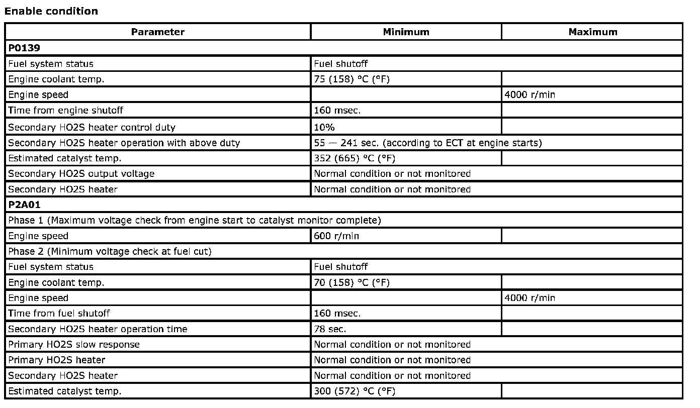 A secondary HO2S is used for catalyst monitoring and dual oxygen sensor control for fuel control system. During monitoring conditions, the system measures maximum and minimum output voltages and compares the voltage with malfunction criteria.