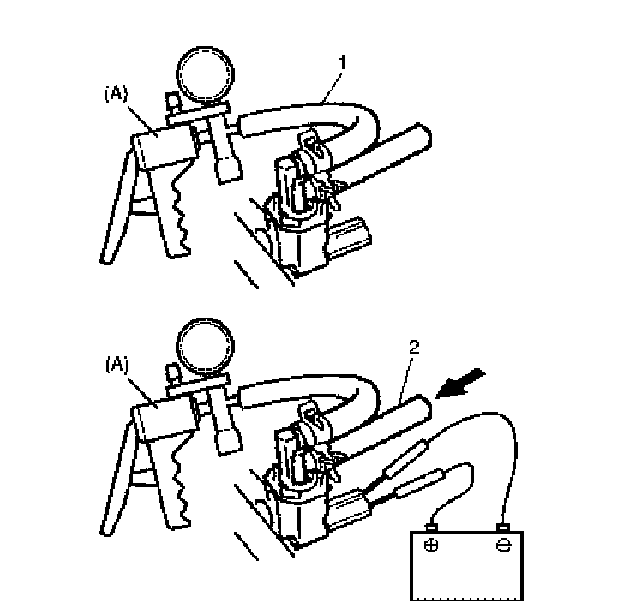 5. In this state, connect 12 V-battery to EVAP canister purge valve terminals. Check that air goes into hose (2).