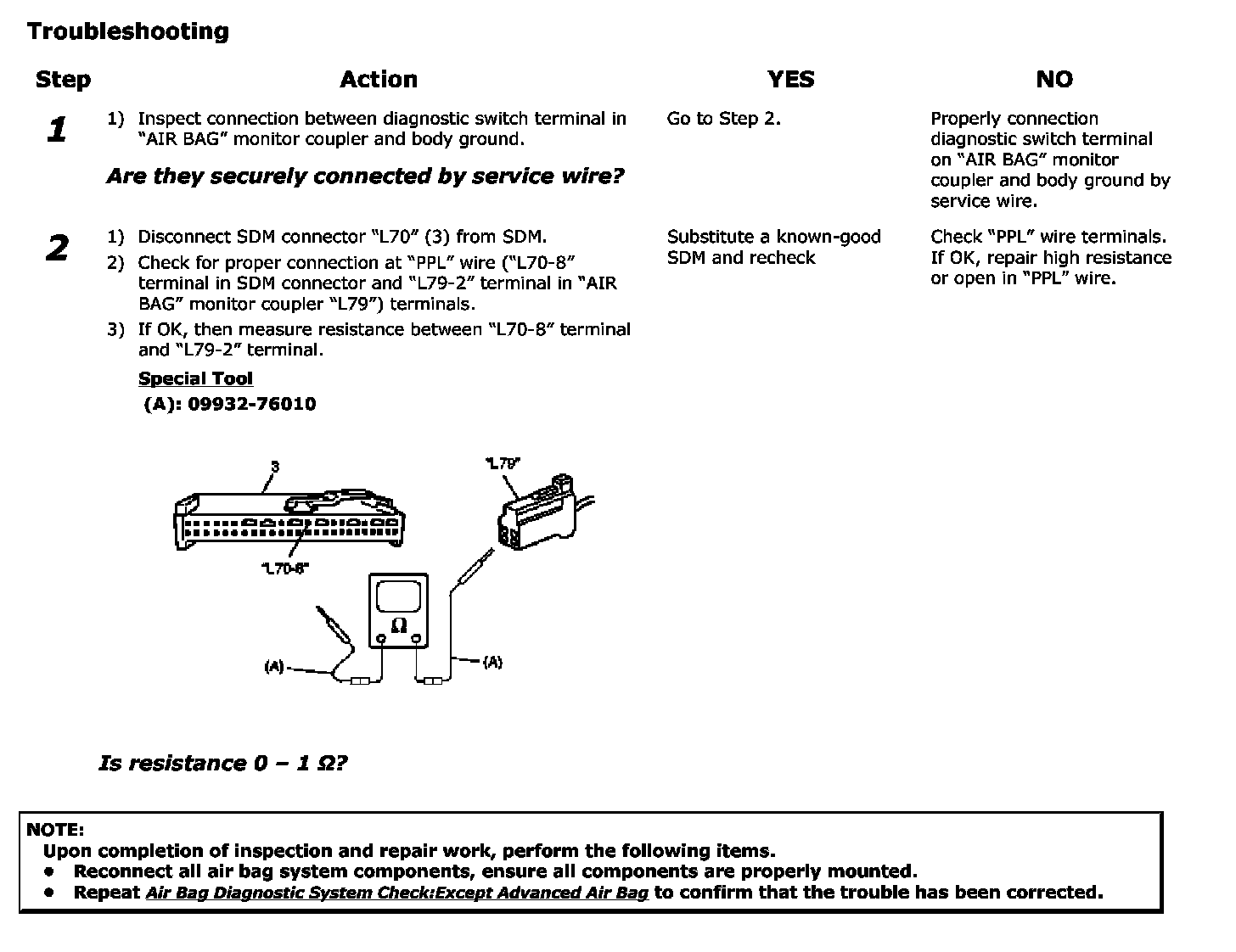 - If there is open circuit in the air bag wire harness, connector or terminal is found damaged, replace the wire harness, connector and terminal as an assembly.