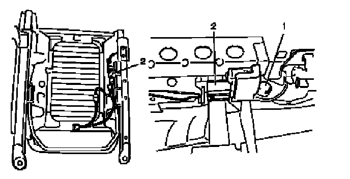 5. Remove seat position sensor bolt (1) and seat position sensor (2) from seat adjuster.