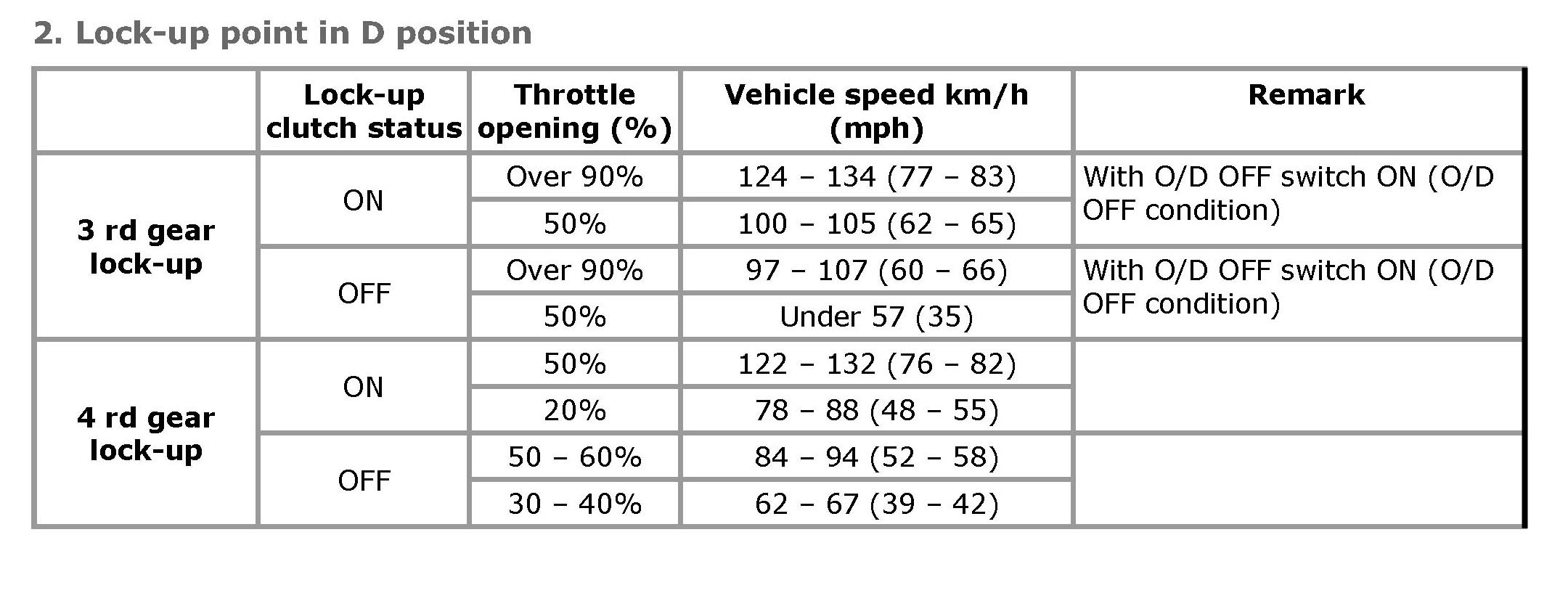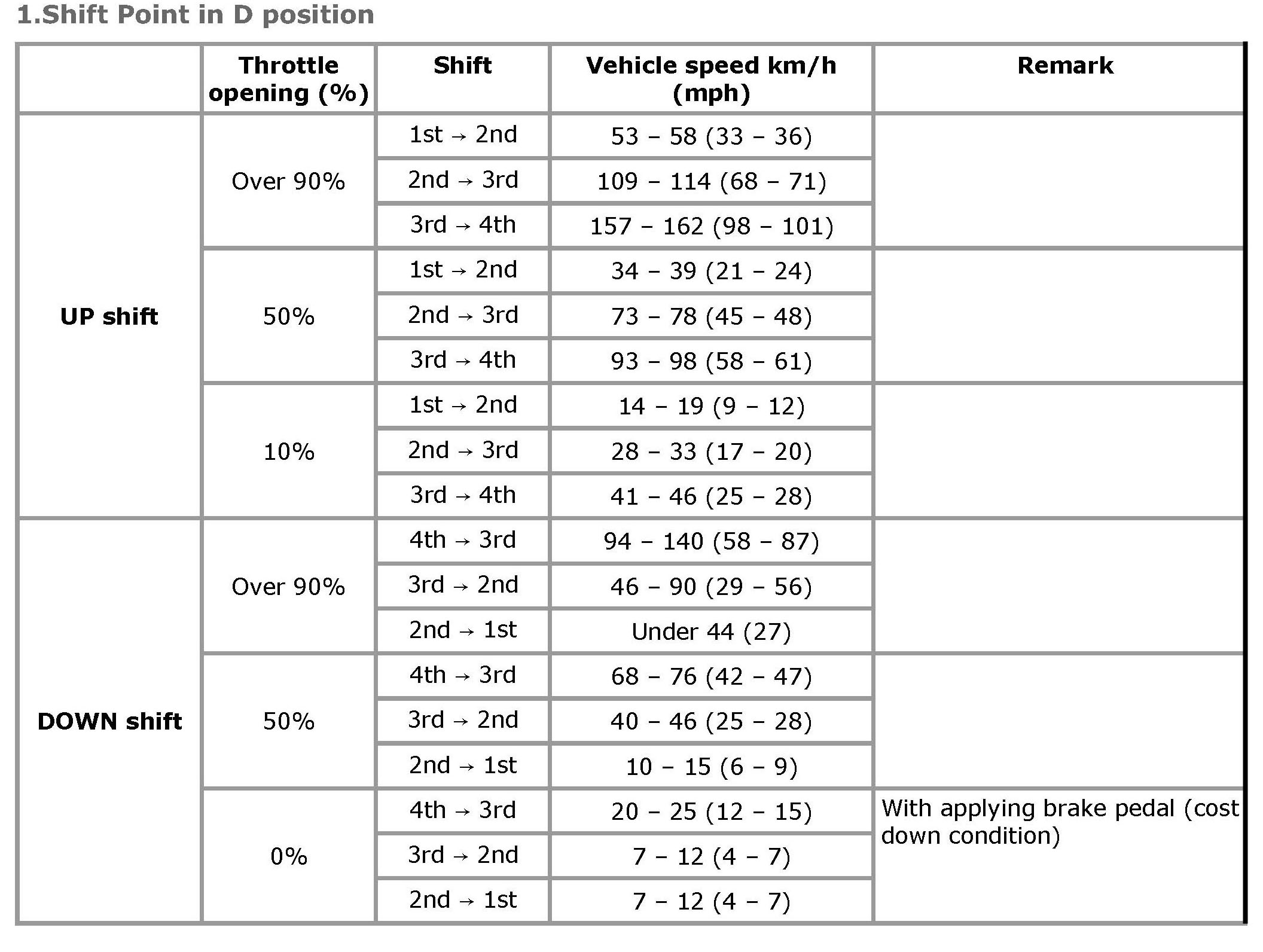 Automatic Gear Shift Table (for 4WD Model)Automatic gear shift schedule is shown in the following table. Test-drive the vehicle on a flat road in the D position and normal mode.