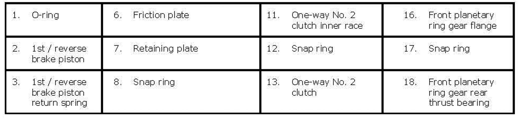 1ST / Reverse Brake and One-Way No. 2 Clutch Components (part 1):