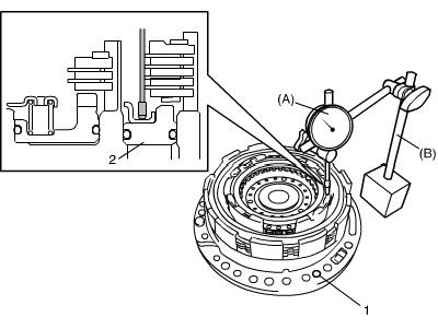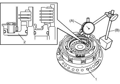 2. Measure 2nd coast brake piston stroke while applying and releasing compressed air (400 - 800 kPa, 4 - 8 kg/cm2, 57 - 113 psi) through oil hole (1) by using special tools.