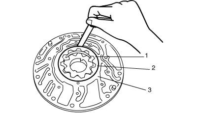Push driven gear (2) to one side of oil pump body (3). Using a feeler gauge, measure clearance between driven gear (2) and body (3). If clearance exceeds standard value, replace oil pump assembly.