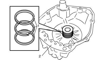 2. Press forward clutch accumulator piston (2) into transaxle rear cover.