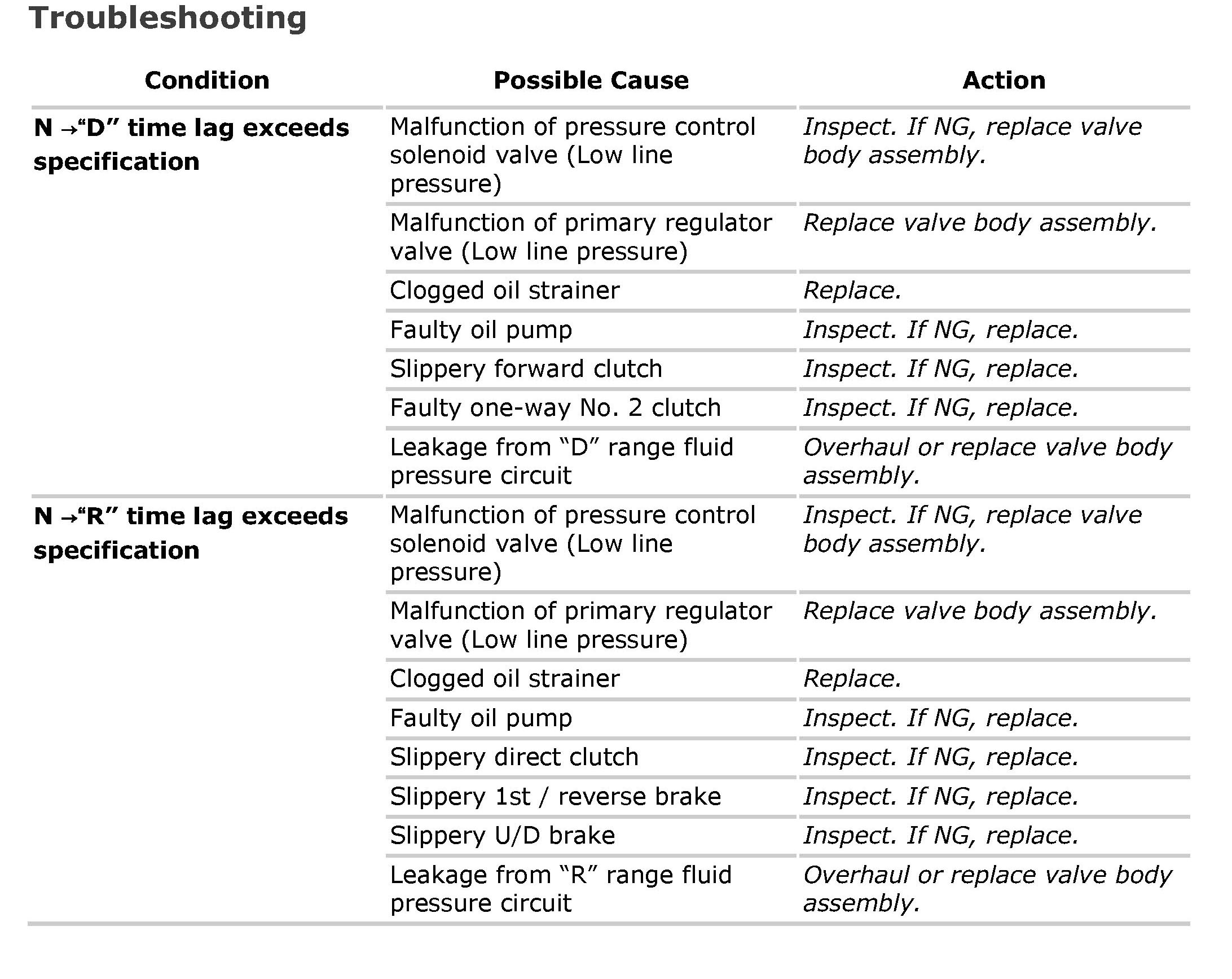 Time Lag TestThis test is to check conditions of clutch, reverse brake and fluid pressure. Time lag means time elapsed since select lever is shifted with engine idling till shock is felt.