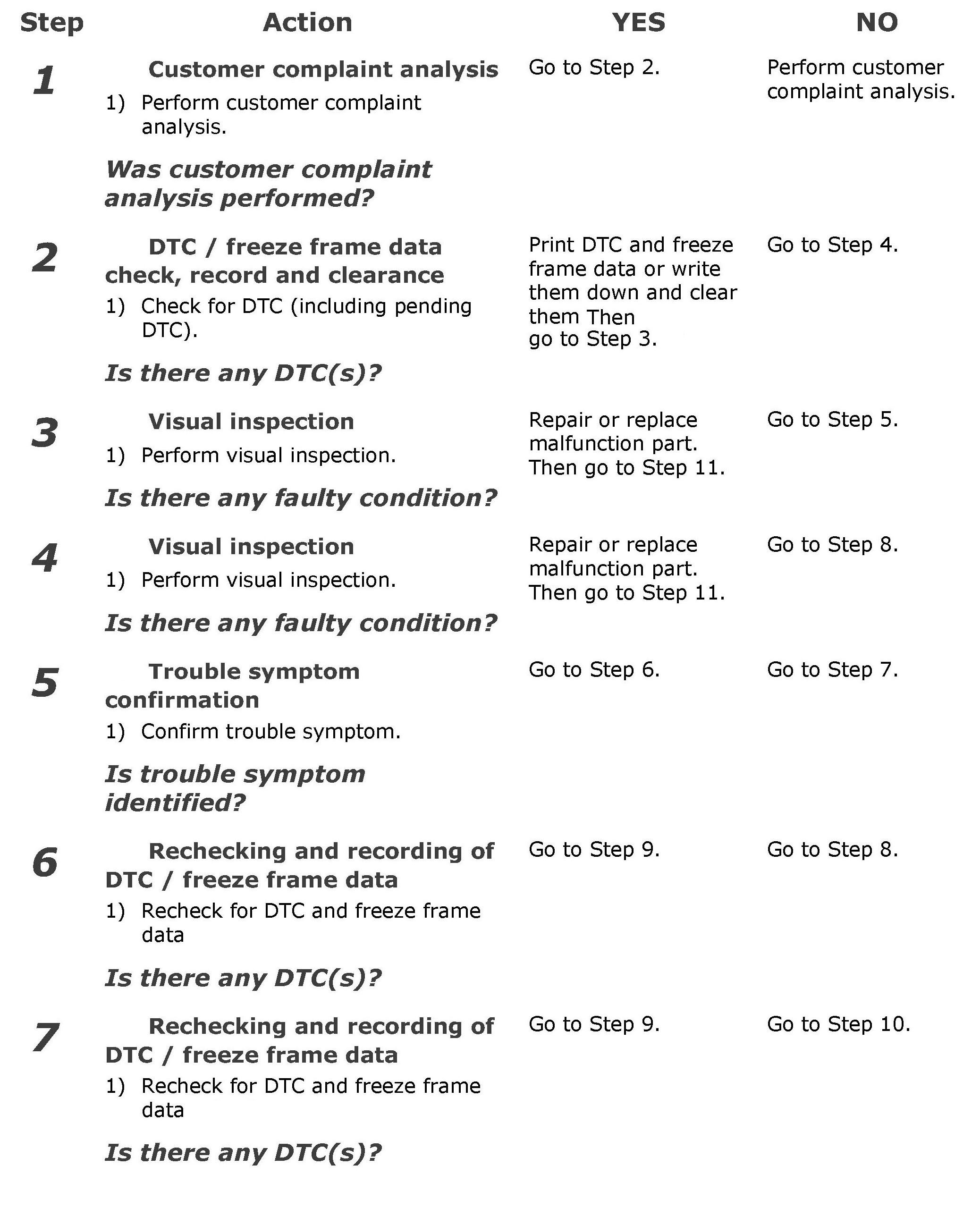 Check trouble symptoms based on information obtained in Step 1 Customer Complaint Analysis and Step 2 DTC / Freeze Frame Data Check, Record and Clearance.