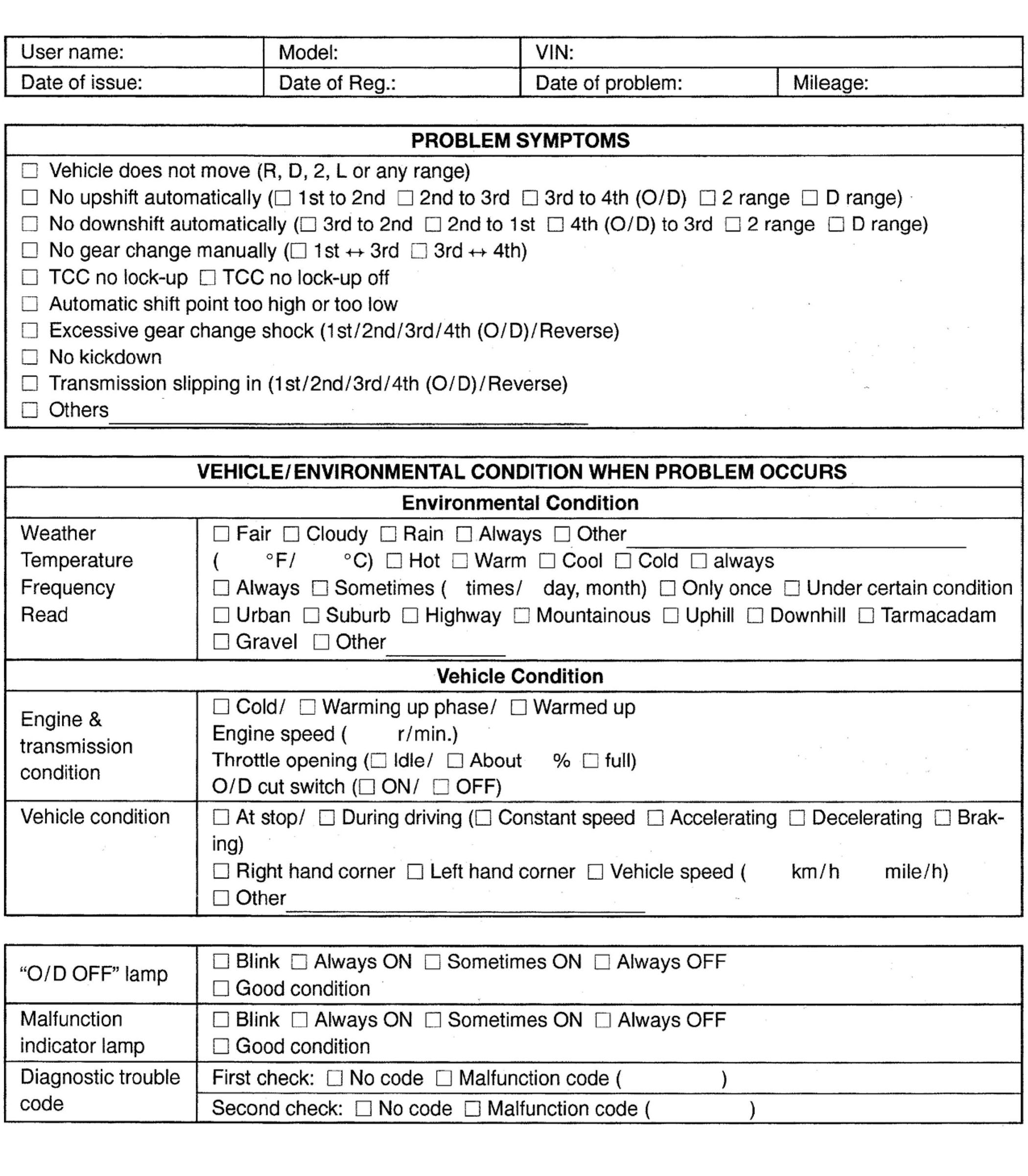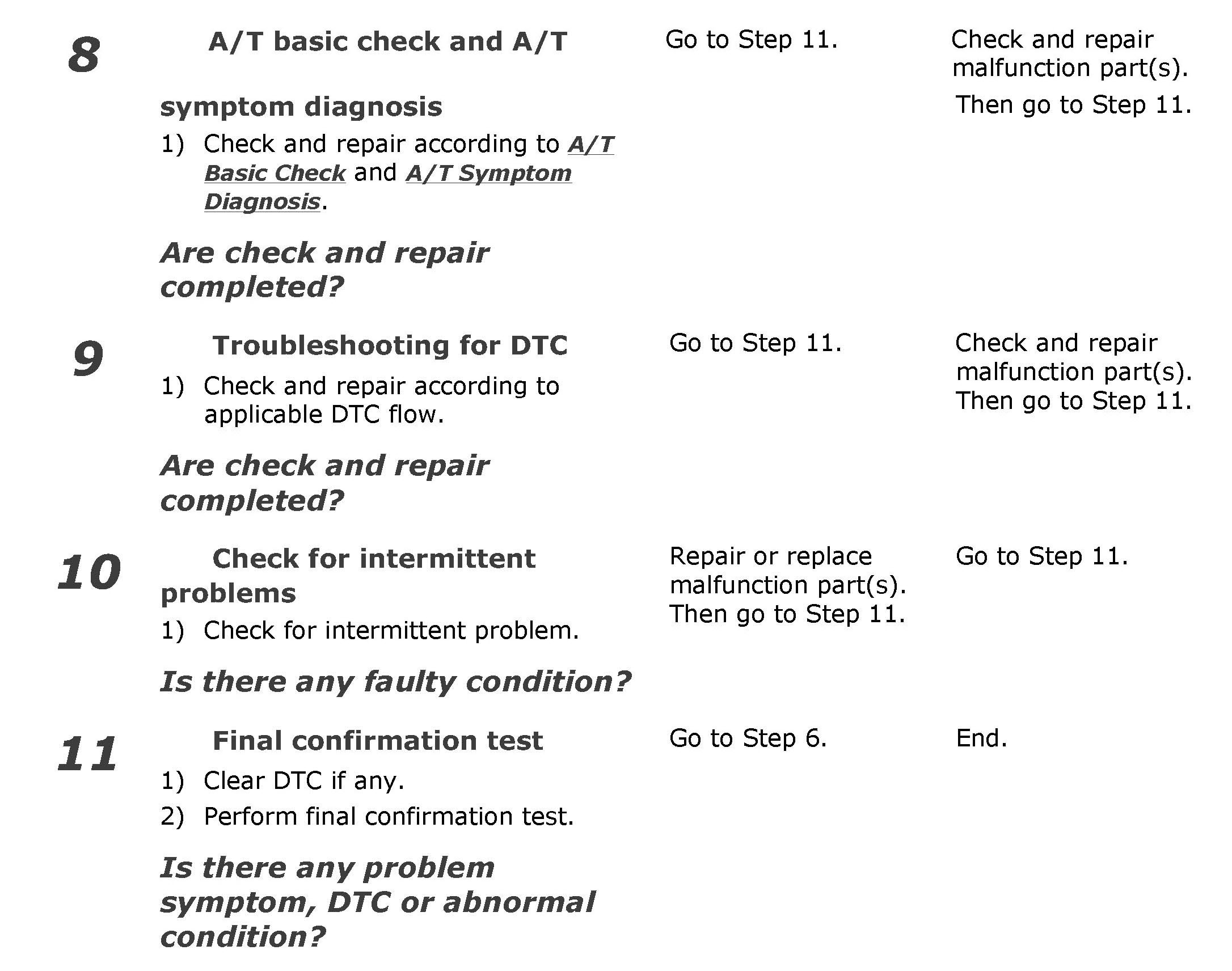 Perform basic check of A/T according to A/T Basic Check first. When the end of the flow has been reached, check the parts of the system suspected as a possible cause referring to A/T Symptom Diagnosis and based on symptoms appearing on the vehicle (symptoms obtained through steps of customer complaint analysis, trouble symptom confirmation and/or A/T basic check) and repair or replace faulty parts, if any.