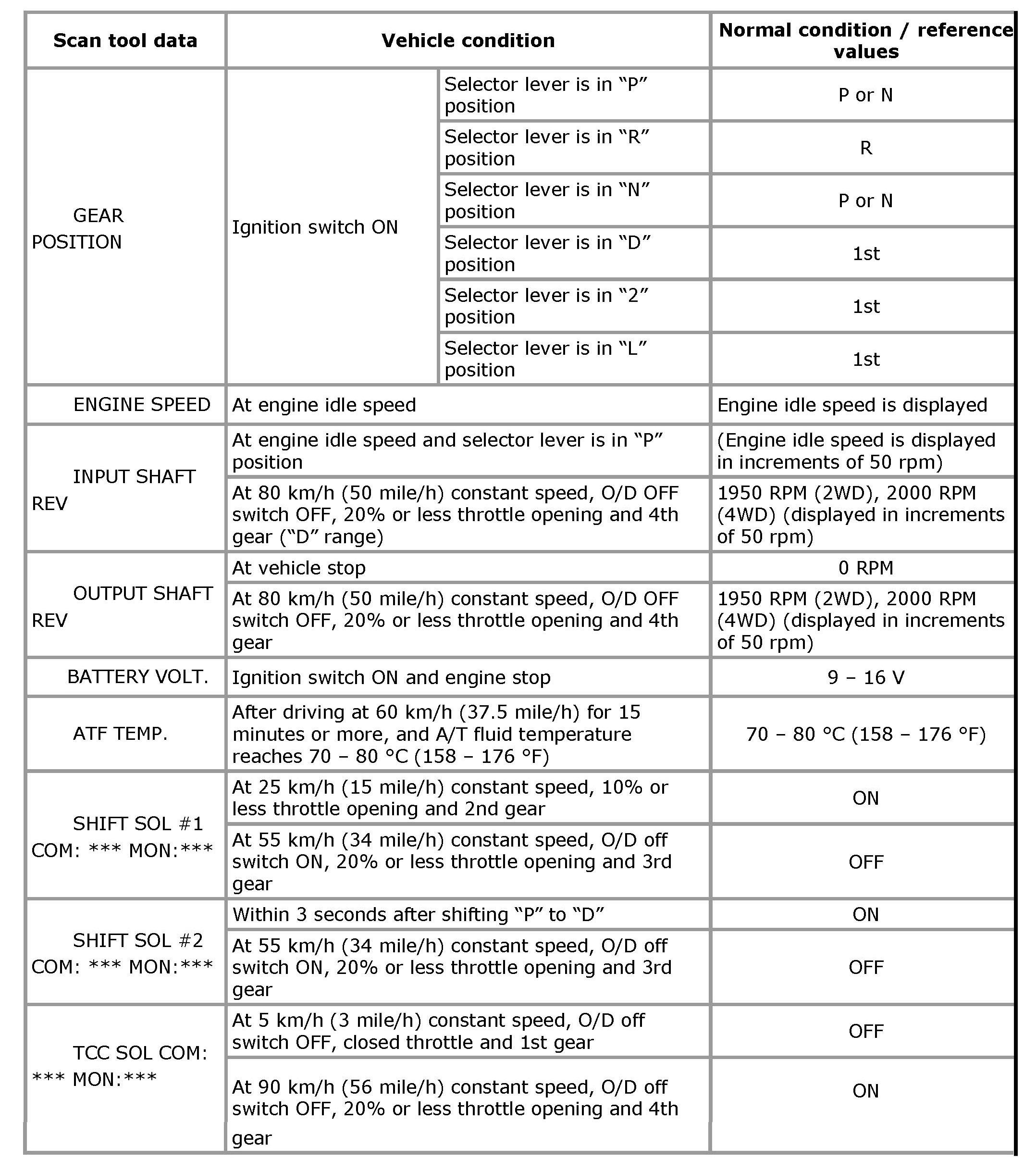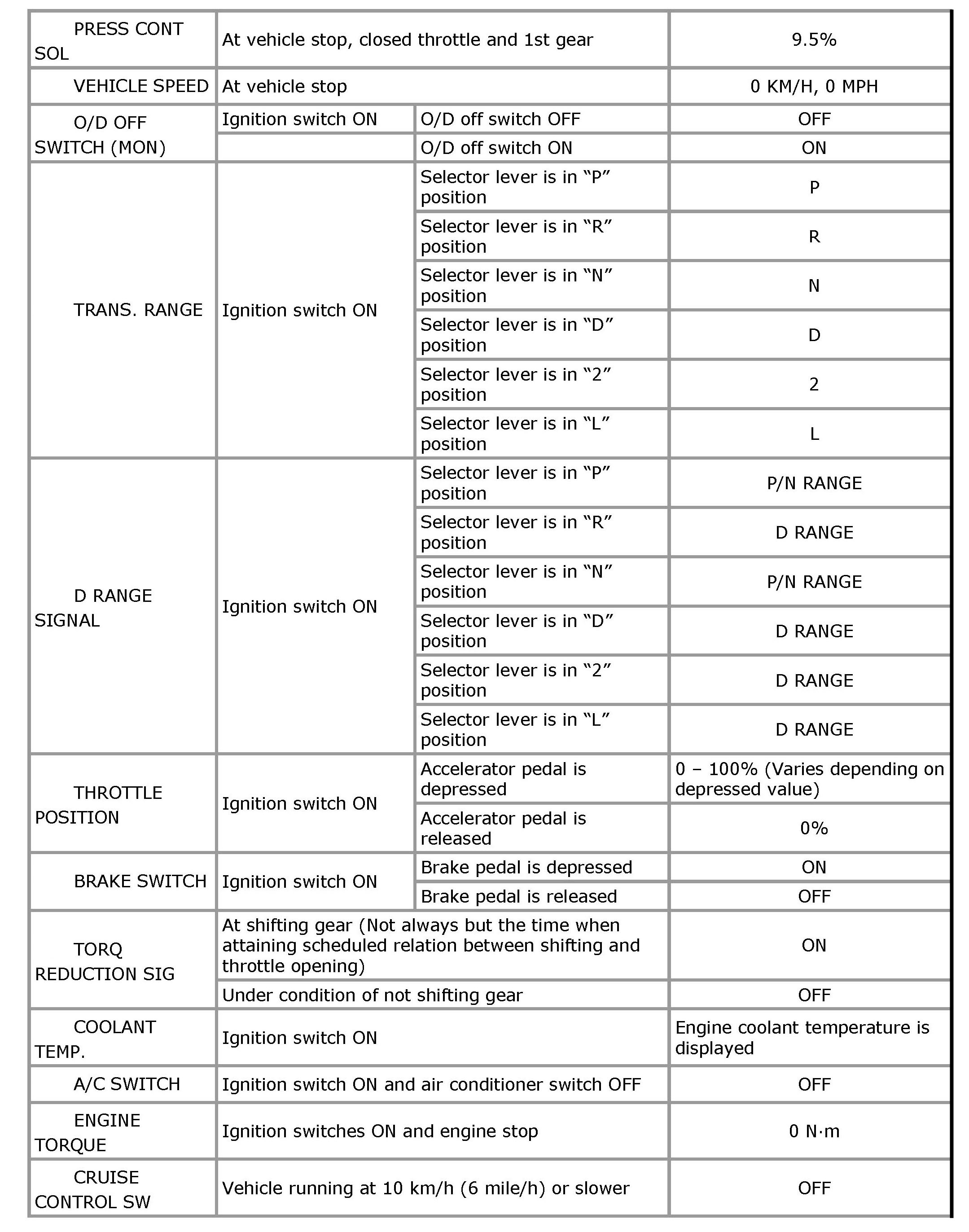 Also, condition in the following table that can be checked by the scan tool are those detected by TCM and output from TCM as commands and there may be cases where the automatic transaxle or actuator is not operating (in the condition) as indicated by the scan tool.