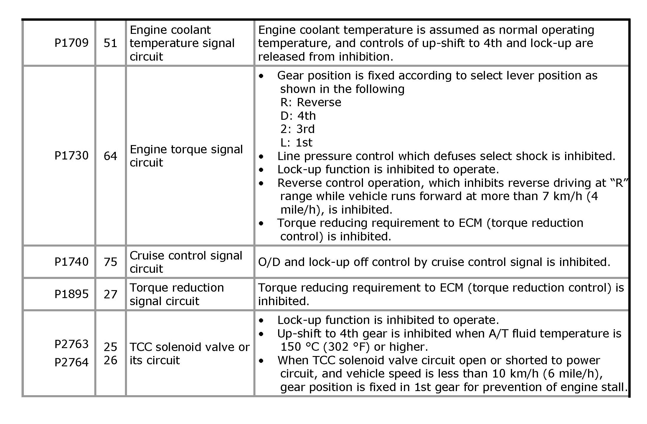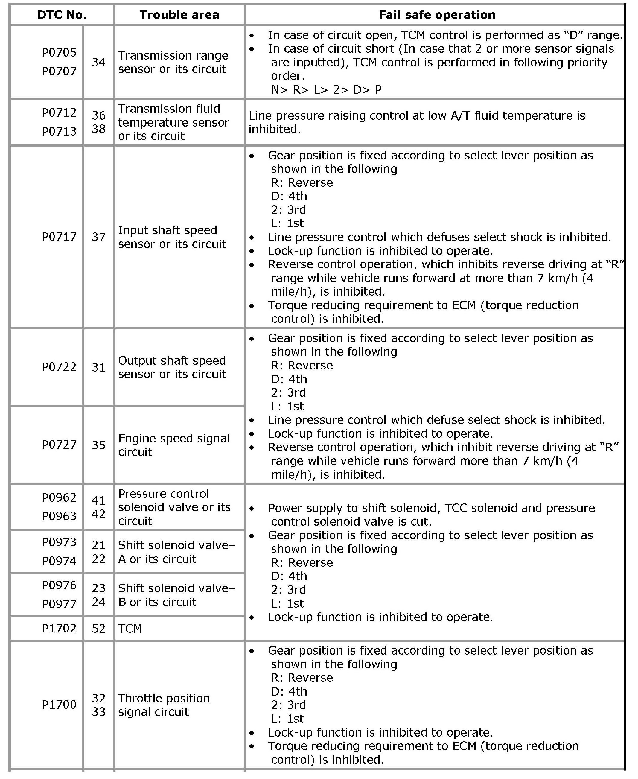 Fail Safe TableThis function is provided by the safe mechanism that assures safe driveability even when the solenoid valve, sensor or its circuit fails. The following table shows the fail safe function for each fail condition of sensor, solenoid, TCM or its circuit.