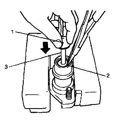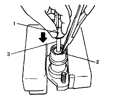 3. With piston pushed rod (3) down, install circlip (2) as shown.