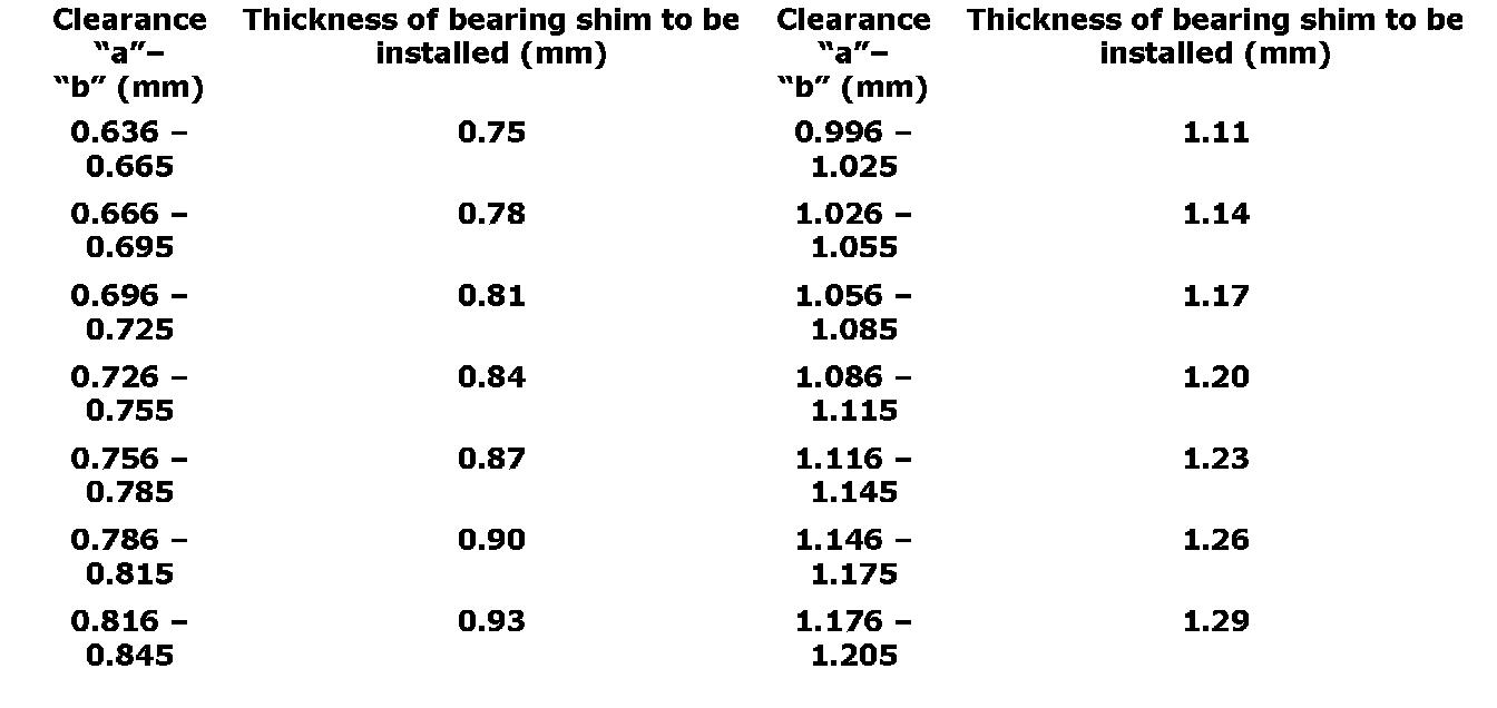 Available differential bearing shim thickness 0.3 mm (0.011 inch) 0.69 mm (0.027 inch) 0.81 mm (0.031 inch) 0.6 mm (0.023 inch) 0.72 mm (0.028 inch) 0.84 mm (0.033 inch) 0.63 mm (0.024 inch) 0.75 mm (0.029 inch) 0.87 mm (0.034 inch) 0.66 mm (0.025 inch) 0.78 mm (0.030 inch)