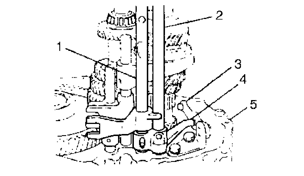 2. Install 5th & reverse gear shift shaft (1) with 5th & reverse gear shift guide shaft (2) into right case (5). Reverse gear shift arm (4) has to be joined with reverse gear shift lever (3) at the same time.