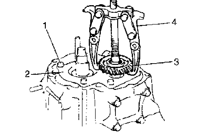 11. Remove input shaft 5th gear needle bearing and then countershaft 5th gear (3). Gear puller (4) would be necessary if spline fitting of countershaft 5th gear is tight.