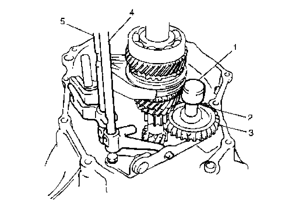 6. Pull out reverse gear shaft (1) with washer (2), then take off reverse idler gear (3).