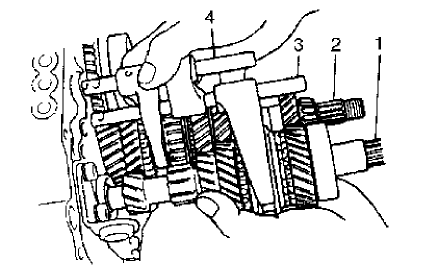 8. Tapping input shaft end with plastic hammer, push it out as assembly from case a little, then take out input shaft assembly (1), countershaft assembly (2), high speed gear shift shaft (3) and low speed gear shift shaft (4) all at once.