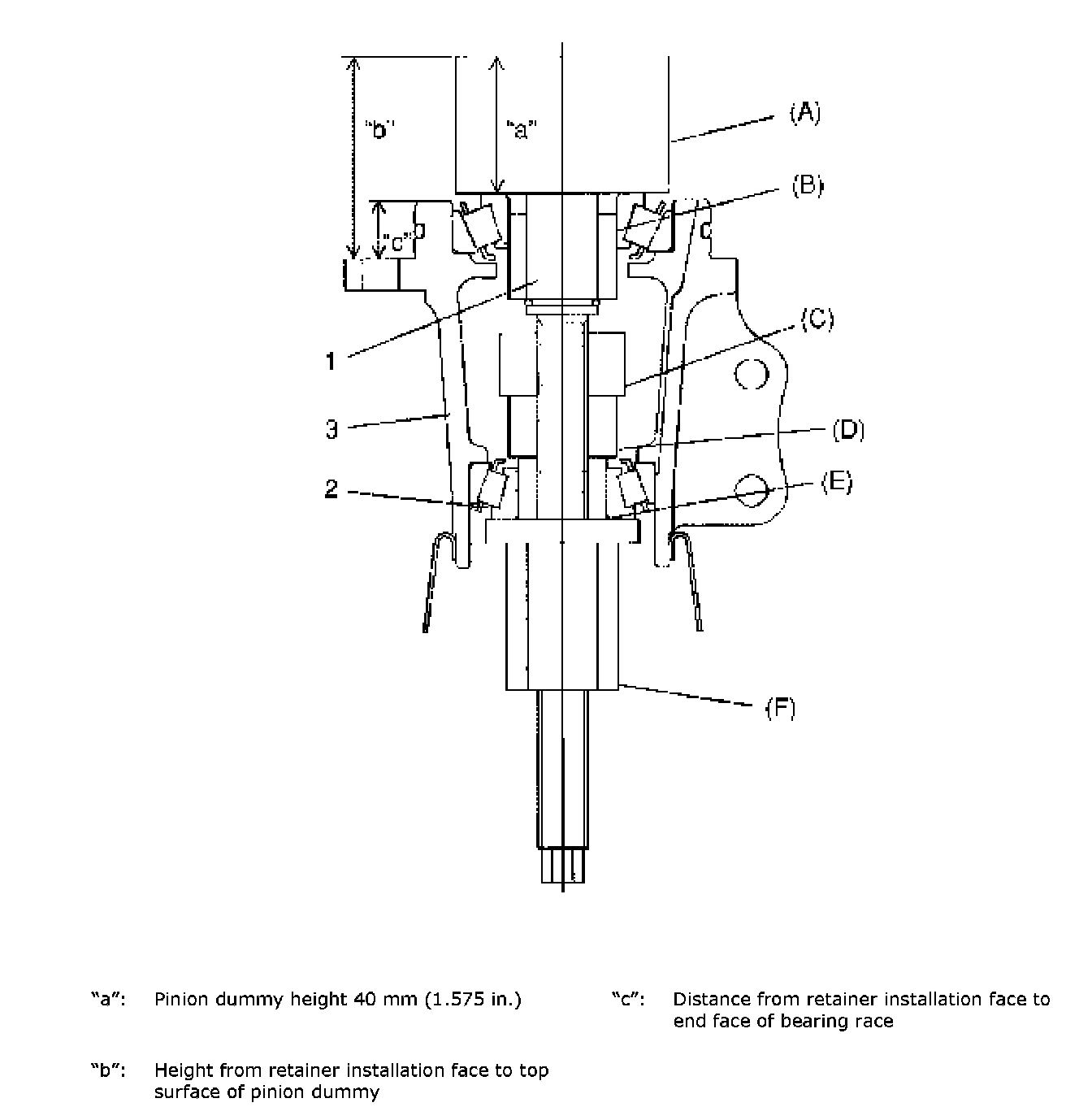 2. Install bevel pinion dummy (1), pinion shaft RR taper roller bearing (2) and special tools to transfer output retainer (3).
