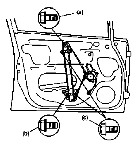 - Tighten front door window regulator attaching bolts to proper tightening order.