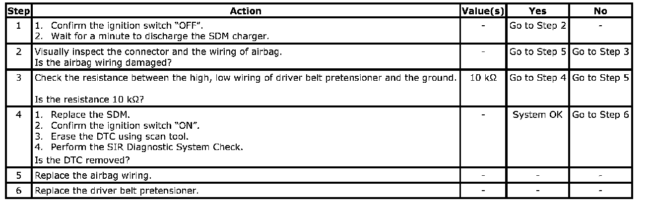 The SDM checks the wiring connection to driver belt pretensioner module by letting the infinitesimal current flow through the internal circuit and verify the resistance. If the resistance is in the 2 kOhms between 10 kOhms, the defect may occur depending upon SDM. The normal resistance is over 10 kOhms.
