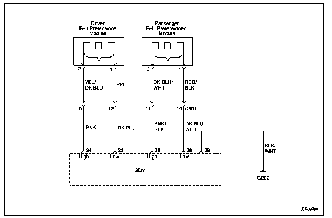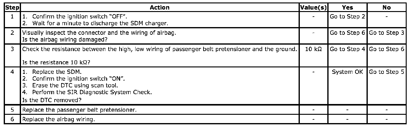 The SDM checks the wiring connection to the passenger belt pretensioner module by letting the infinitesimal current flow through the internal circuit and verify the resistance.